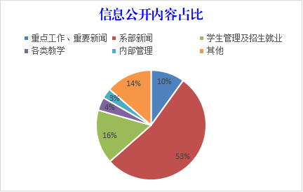 按内容分,有关学院重点工作、重要新闻的966条,占信息总数的9.9%,系部新闻5224条,占信息总数的53.6%,涉及学生管理及招生就业的1552条,占信息总数的15.9%,涉及各类教学的380条,占信息总数的3.9%,涉及人事任免、职称评聘、财务、资产、总务等内部管理信息公示的293条,占信息总数的3.0%,其他1333条,占信息总数的13.7%。